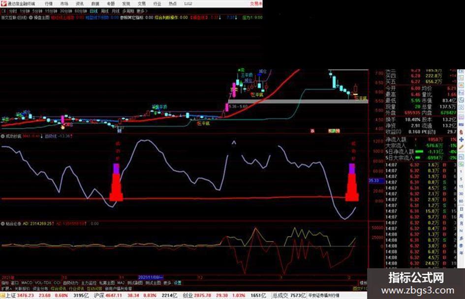 底部:=IF((趋势线<=5),58,0),COLORFF00FF;