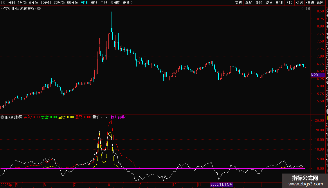 拉升预警:IF(FILTER(启动>0 AND 启动<0.5 AND GUP2E AND GUP1C<3,10)=1,10,0),COLORMAGENTA;