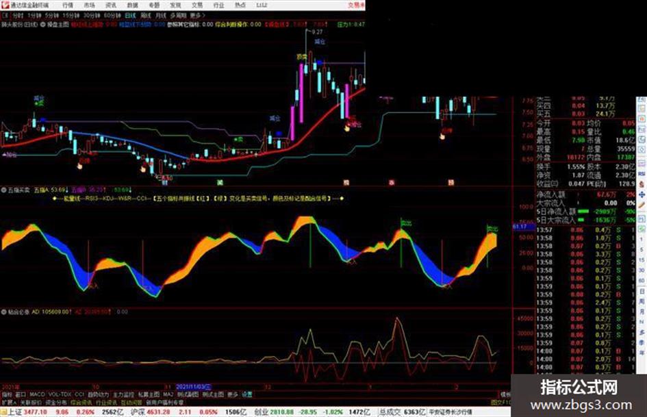 五指B:WMA((能量线+RSI+J-威廉WR+CCI)/5,13);