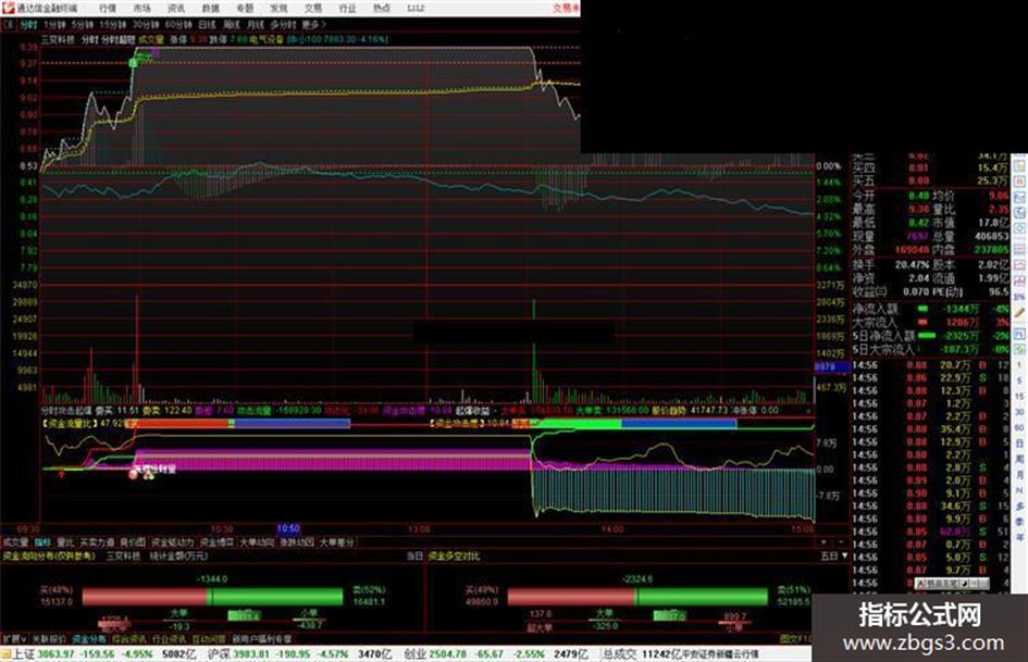 大单卖:(SUM(IF(C<REF(C,1) AND V>4000,V/1000,0),0))*1500,COLORGREEN,LINETHICK3;