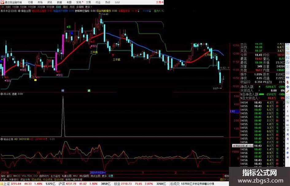 选股:IF(AA4>0 AND COUNT(AA4>0,10)=1 AND AA3<100 >=1 AND (H-C)/C*100<1 AND REF(C<O,1) ,5,0);