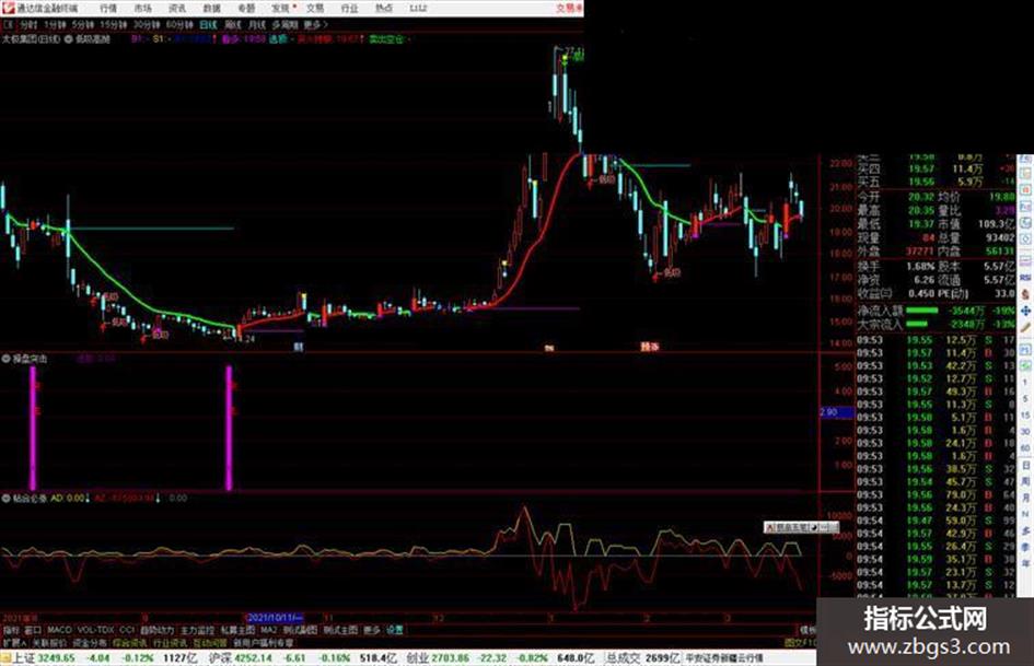 短线:=(CLOSE-MA(CLOSE,13))/MA(CLOSE,13)*20,LINETHICK0,COLORWHITE;中线:=(CLOSE-MA(CLOSE,4))/MA(CLOSE,4)*20,LINETHICK0,COLORYELLOW;VAR200:=(CLOSE-LLV(LOW,20))/(HHV(HIGH,20)-LLV(LOW,20))*100;VAR300:=SMA(SMA(VAR200,3,1),3,1)/28.57;VAR400:=EMA(VAR300,5);操盘:=3*VAR300-2*VAR400;A1:=CROSS(操盘,VAR300) AND VAR300<2.1 AND C>O;STICKLINE(A1,5,0,4,0),COLOR770077;STICKLINE(A1,5,0,3,0),COLOR990099;STICKLINE(A1,5,0,2,0),COLORBB00BB;STICKLINE(A1,5,0,1,0),COLORDD00DD;STICKLINE(A1,5,0,0.3,0),COLORFF00FF;DRAWTEXT(A1,4.2,'突'),COLORRED;DRAWTEXT(A1,3.2,'击'),COLORRED;选股:CROSS(操盘,VAR300) AND VAR300<2.1 AND C>O,COLOR770077;