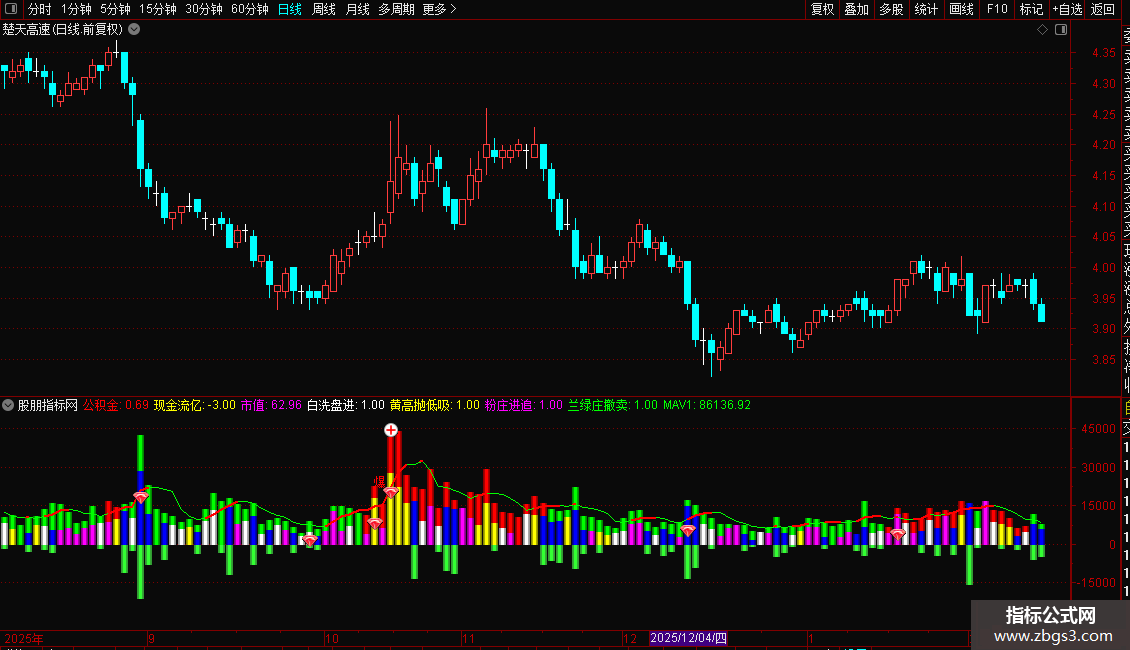 当满足条件(收盘价<收盘价的30日简单移动平均)时,在0和成交量(手)位置之间画柱状线,宽度为0.5,0不为0则画空心柱.,COLOR00FF00