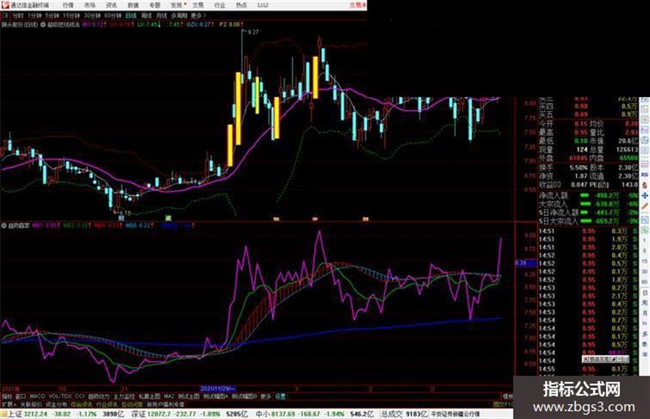 也是分三条线,紫线是个股强弱分界线,紫线向下走最好不参与,即使上涨,多数也是超跌反弹