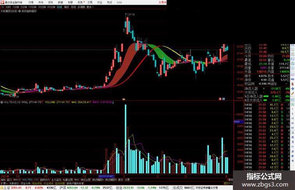 主图有红色粗带和绿色粗带,分别代表趋势走强、趋势走弱