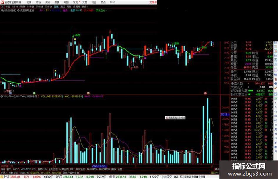 S2:=IF(VC>20 AND FILTER(VC< REF(VC,1),5),H+0.02,DRAWNULL),CIRCLEDOT,LINETHICK3,COLORGREEN;