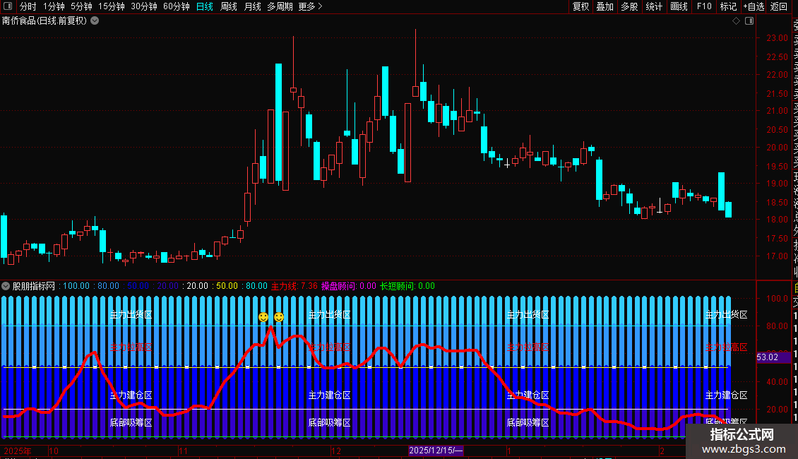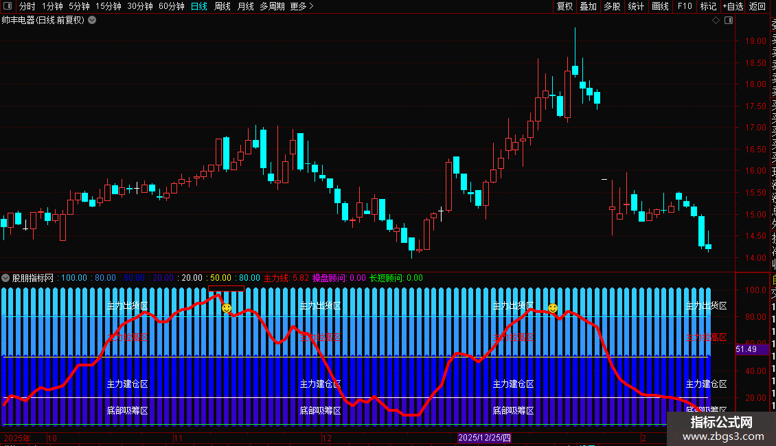 DRAWTEXT(FILTER(CLOSE>0,25),88,'主力出货区'), , COLORWHITE;