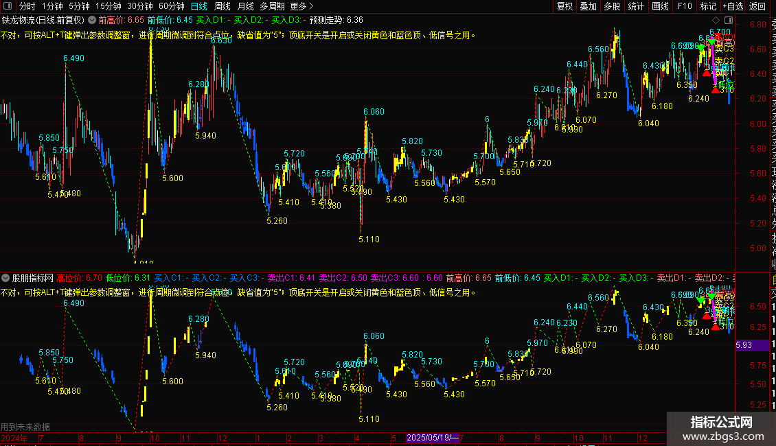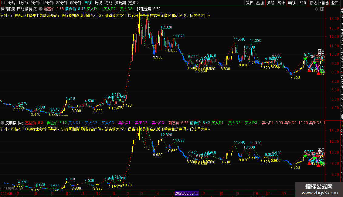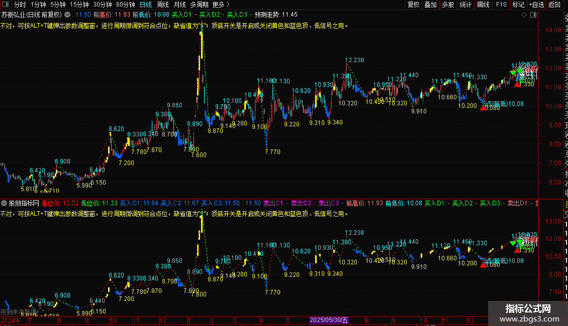 DRAWTEXT_FIX(1,0.65,0.01,1,'说明: 如果高、低位各自动选点不对,可按ALT+T键弹出参数调整窗,进行周期微调到符合点位,缺省值为“5”;顶底开关是开启或关闭黄色和蓝色顶、低信号之用。'),COLORYELLOW;
