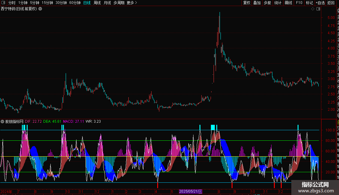 WR:100-100*(HHV(HIGH,N)-CLOSE)/(HHV(HIGH,N)-LLV(LOW,N)),COLORFFFFFF;