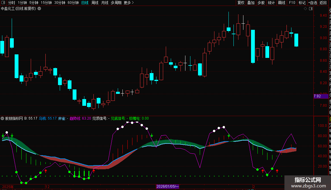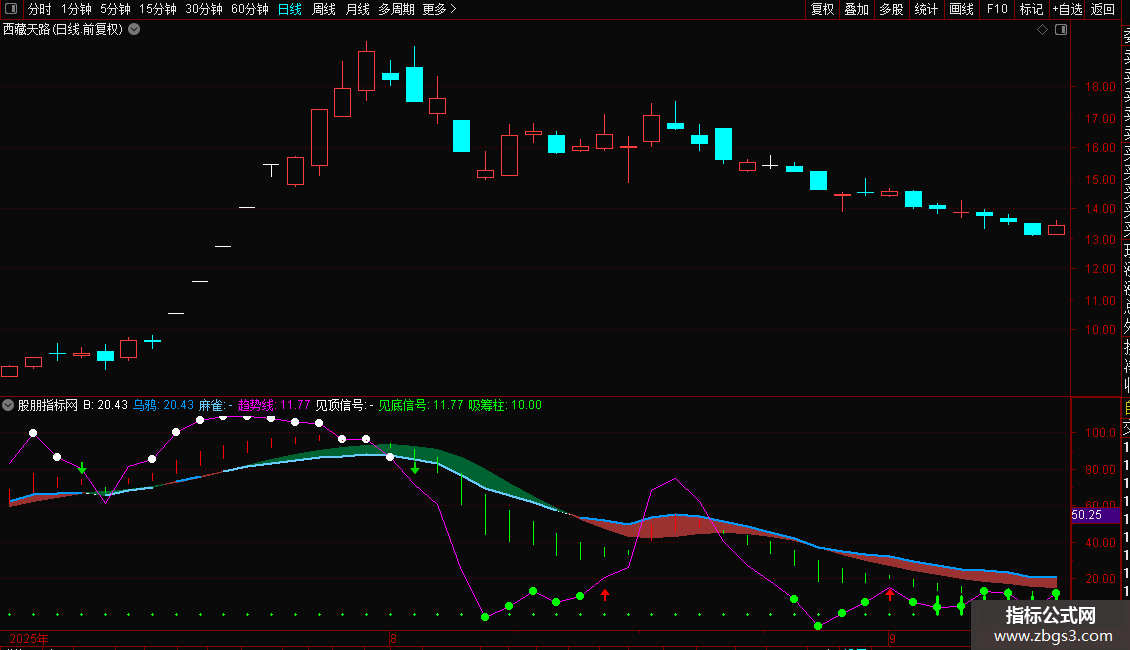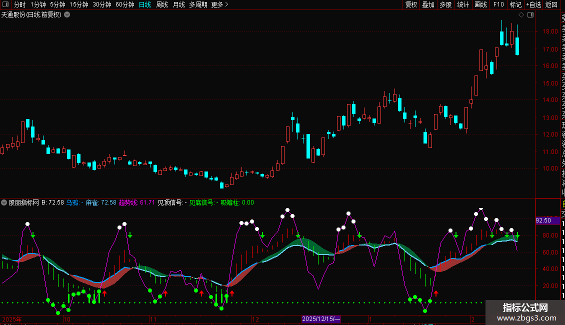 见底信号:IF(趋势线<=15,趋势线,DRAWNULL),CIRCLEDOT,COLOR00FF00,LINETHICK3;