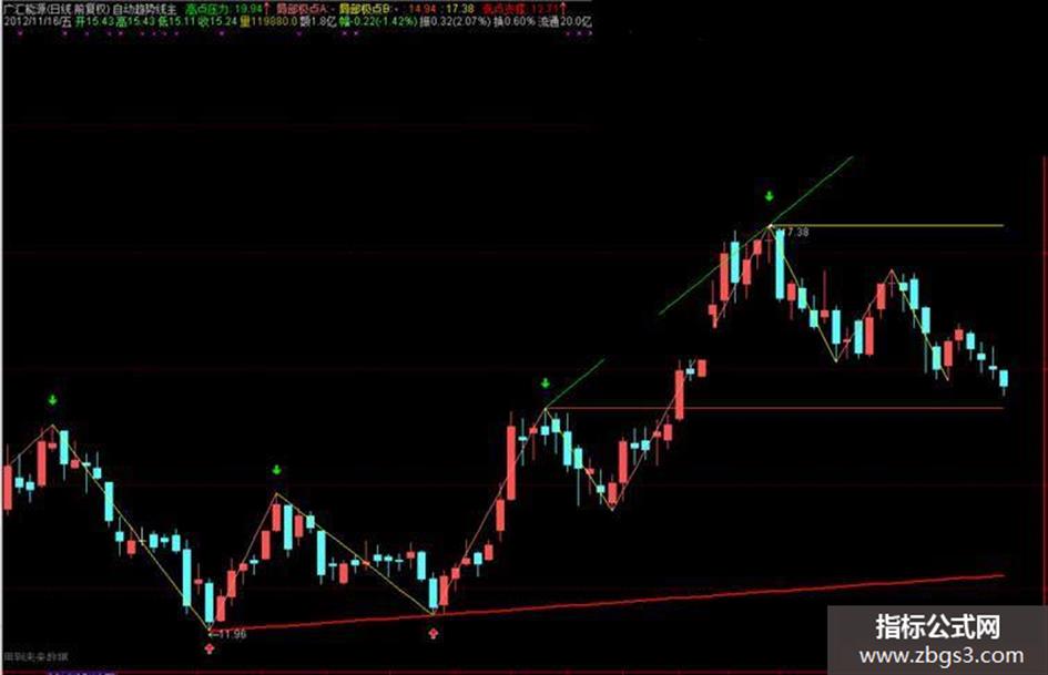 自动趋势线--就是根据过去已发生的高低点走势自动画线并能够告诉你目前的位置处在什么地方的一种主图,同时也能标出高点压力、低点支撑、局部极点,我介绍的这款自动趋势线主图与首富软件的指标不完全一样,但大同小异。