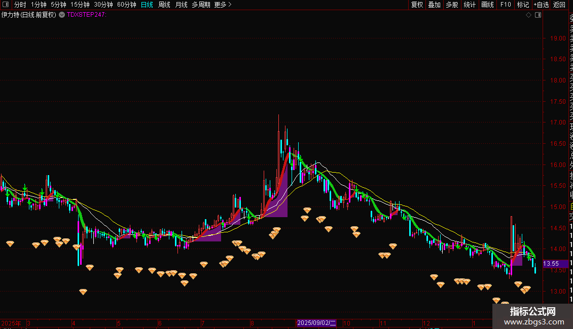 均线压制(2号图标):当股价向下击穿14日均线时,在K线上方标注信号。