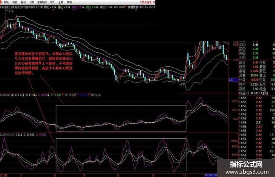 此KDJ公式RSV是采用的相对于34日布林中轴的变化系数来表达,这个KDJ不同于一般意义的价格KDJ,表达的是在价格标准差意义上的波动,并非简单的价格上下波动,因此,如果你要使用这个公式,需要寻找的反而不是波动比较大的地方的金叉,要找曲线波动小KDJ值也比较小的地方的信号。一定要理解这个意义,否则你混淆起来还不如不用的好。