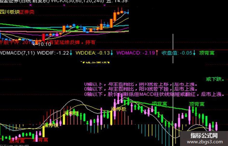 DRAWTEXT(CURRBARSCOUNT=40,WZ*1.10,'0轴以上,与主图相比,阴K线若高收,后市下跌。')COLOR44FF00;