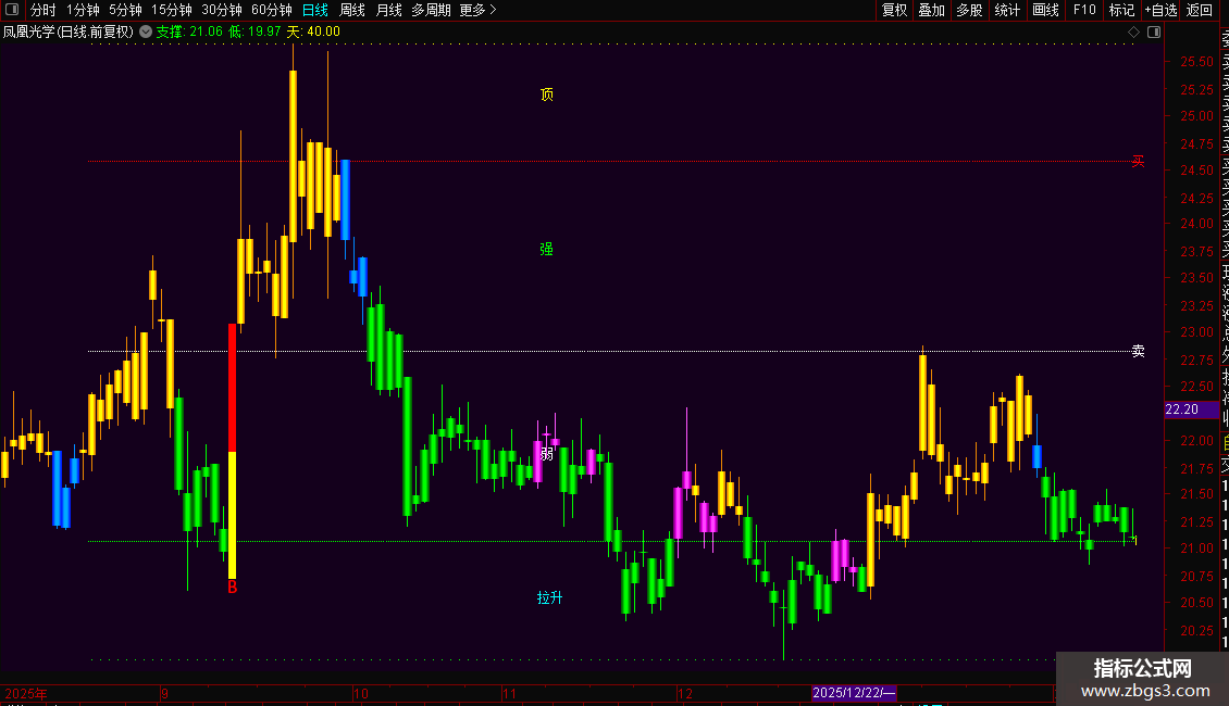 3. 趋势判断:结合K线颜色判断当前短期趋势(蓝上绿下),并注意紫色和橙色K线所代表的趋势内调整状态。