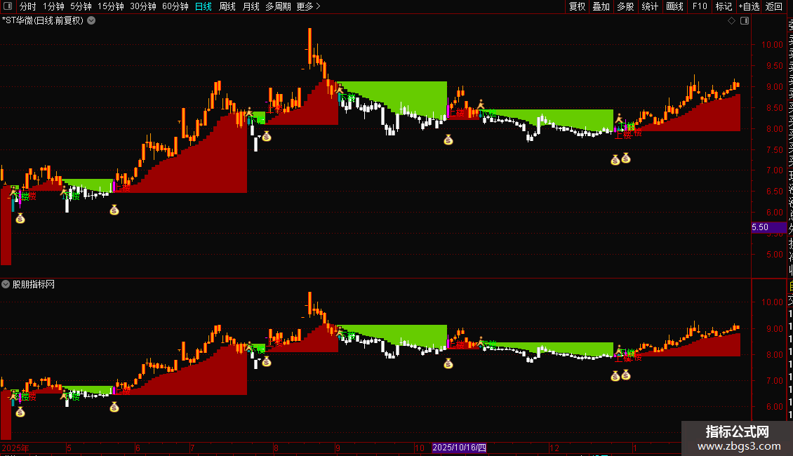 指标将K线用颜色编码,使趋势状态一目了然。
