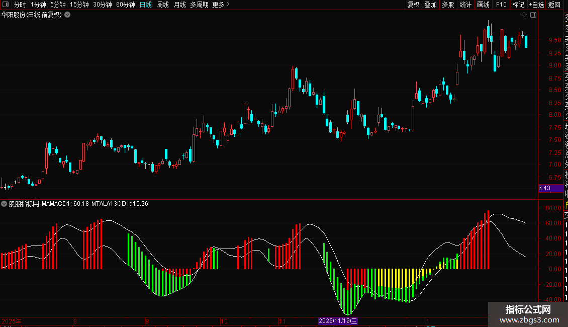该指标包含两组MACD计算,并采用柱状线进行可视化对比。