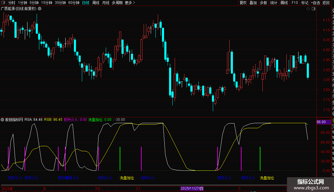 初升介入:当RSA线由下向上穿越RSB线时,副图会显示蓝色柱状信号,并在坐标轴-15位置标注蓝色文字“初升介入”。此信号提示可能出现的上涨启动点。