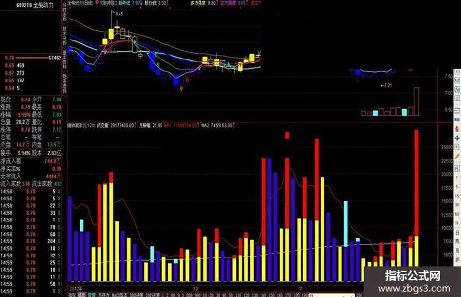 图说明:1.黄色持股,蓝色持币。2.红色B出现买入。3.绿色箭头出现“逃顶”减仓,绿色S出现卖出。主图中加入10日的成交量。