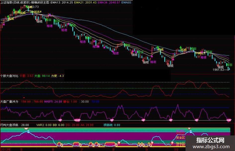4.巧判大盘顶底(副图):大盘分4个区位,底部介入出出现(红+字)抄底。顶部风险区附近(蓝点)逃命。
