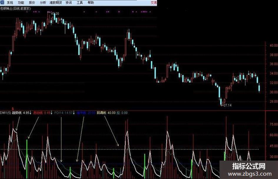 DMI指标玩法多种多样,原公式有点眼花,多空要自己分辨,改一下,在源码几乎没有改变的情况下,用两天原pdi源码原封不动变成柱线,变成启动柱(红色),上穿趋势线且大于20,当然之后的跌破20线,都晓得要做什么了。有一个信号要注意,太高也会不好,预示要回调了。。。图例一看就知道,注意:20线是非常关键的,在趋势线没有上线,会经常回踢。另外,趋势线跌破低点线,眼睛瞪大了,机会就在前面,要是回踢低于低点线,中枢形成了,要是加速下跌,多数属于背离了。