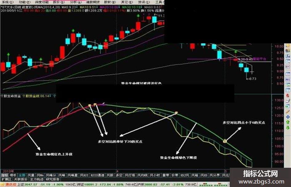 IF(资金生命线<=REF(资金生命线,1),资金生命线,DRAWNULL),COLORGREEN,LINETHICK2;