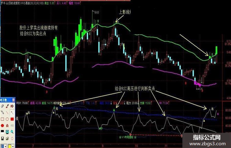 2、股价上穿卖出线继续持有,结合RSI作为判断第一卖出点,当股价回落卖出线时为第二卖出点。