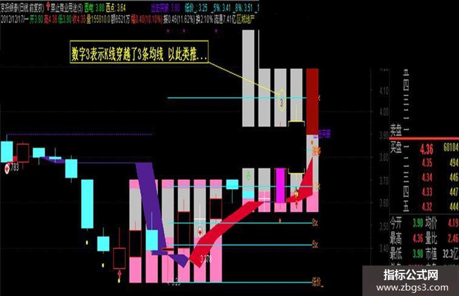 带牡丹红柱体的K线表示K线实体(开盘和收盘)穿越三根或三根以上均线 上方数字表示K线穿越均线根数 数字3表示K线穿越了3条均线 以此类推...