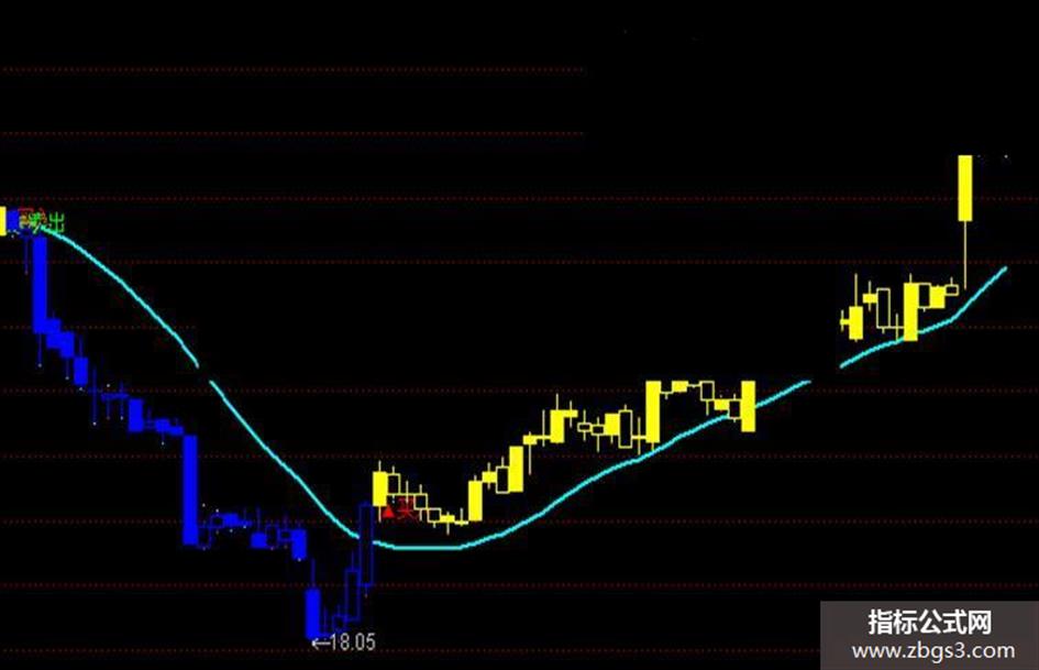 STICKLINE(股价线>趋势线 AND C>=O,H,L,0,0),COLORYELLOW;