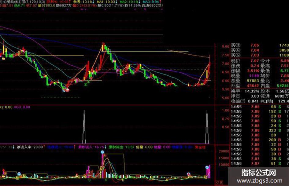 当满足条件净流上穿0时,在0位置书写文字,COLORFF00FF