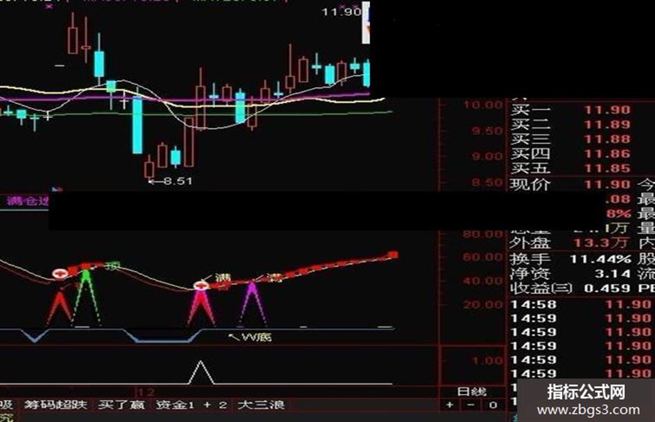 满仓选股:=IF(一阳穿三线,38,0),COLORMAGENTA,LINETHICK3;