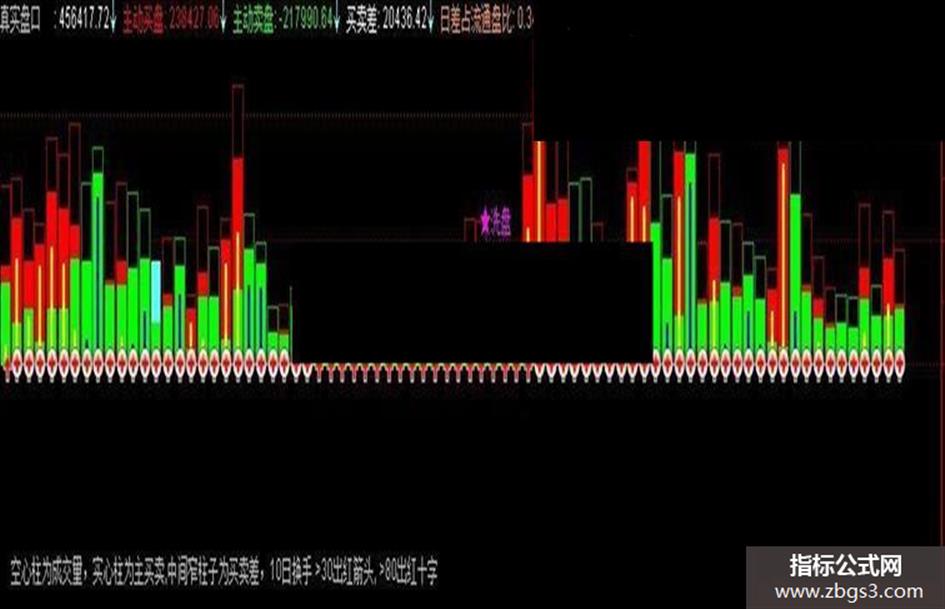 DRAWTEXT_FIX(1,0.01,0.9,0,'空心柱为成交量,实心柱为主买卖,中间窄柱子为买卖差,10日换手 >30出红箭头, >80出红十字'),COLORLIGRAY;