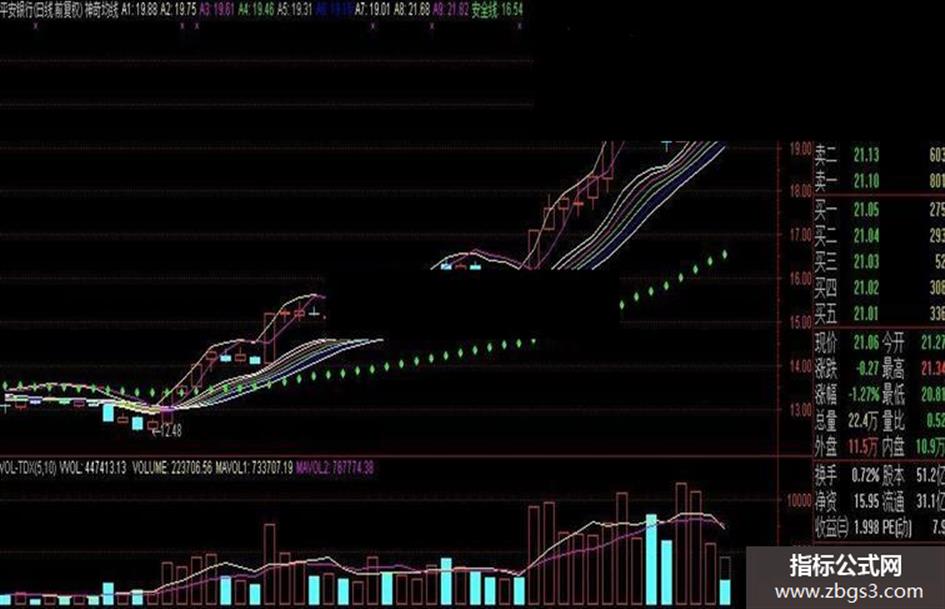 1、买点:当“神奇中线”由向下发散转变为向上收拢并即将或已经开始向上发散时为极佳的买点。当“神奇短线”A8与A9发生“金叉”时为短线“买点”。
