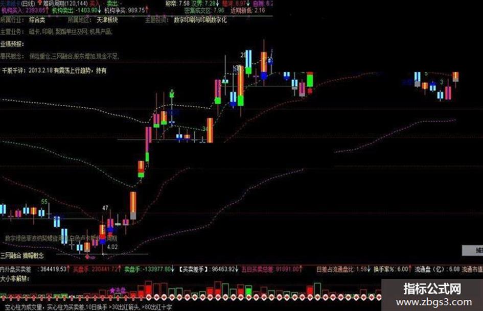 K线中间窄柱子表示机构大单资金买卖净额,流出画蓝色柱子,流入画黄色柱子。