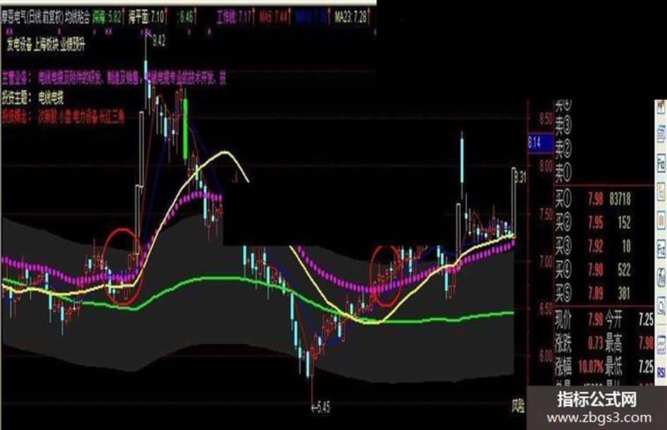 使用方法:股价在工作线(紫色圆点线)之上,海面附近,形成均线多头排列,最好是小阴小阳的爬升,但需要量能的配合,这是大体选股,剩下的操作需要结合另外的指标,进行确认。