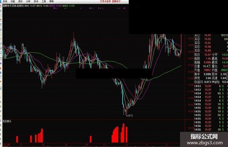 VAR1:=REF(LOW,1); VAR2:=SMA(ABS(LOW-VAR1),13,1)/SMA(MAX(LOW-VAR1,0),13,1)*4; VAR3:=EMA(VAR2,13); VAR4:=LLV(LOW,34); VAR5:=EMA(IF(LOW<=VAR4,VAR3,0),3); 主力进场: STICKLINE(VAR5>REF(VAR5,1),0,VAR5,7,0 ),COLORRED;