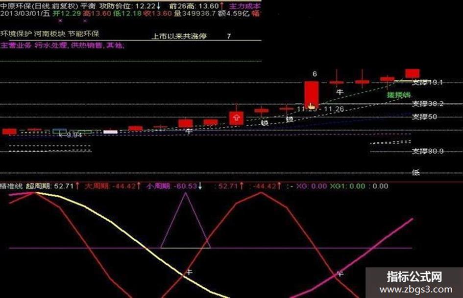 超周期:= COS(VAR1S*1)*100,COLOR00FFFF,LINETHICK3; 大周期:= COS(VAR1S*2)*100,COLOR0000FF,LINETHICK2; 小周期:=COS(VAR1S*4)*100,COLOR575757,LINETHICK0; DRAWTEXT(CROSS(超周期,大周期),L*0.98,'牛'); DRAWTEXT(CROSS(大周期,超周期),L*0.98,'牛');