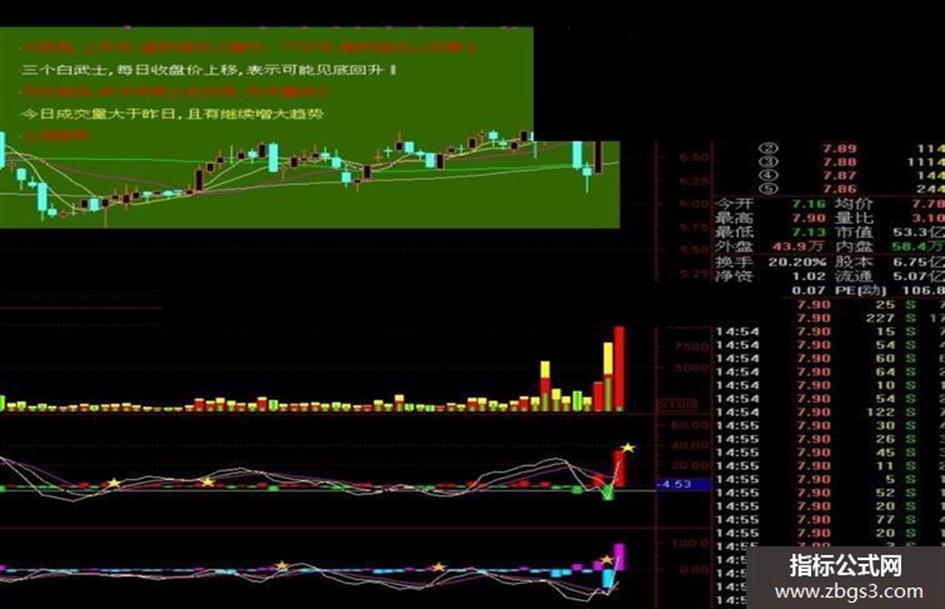 DRAWTEXT(T19=1 AND CURRBARSCOUNT=58,AAA-(AAA*TS19),'三个白武士,每日收盘价上移,表示可能见底回升‖'),COLORFFFFFF ;