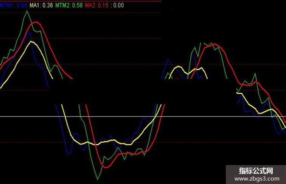 MTM1:CLOSE-REF(CLOSE,13),COLORBLUE; MA1:MA(MTM1,5),LINETHICK2; MTM2:CLOSE-REF(CLOSE,21),COLORGREEN; MA2:MA(MTM2,5),LINETHICK2,COLORRED; 0;