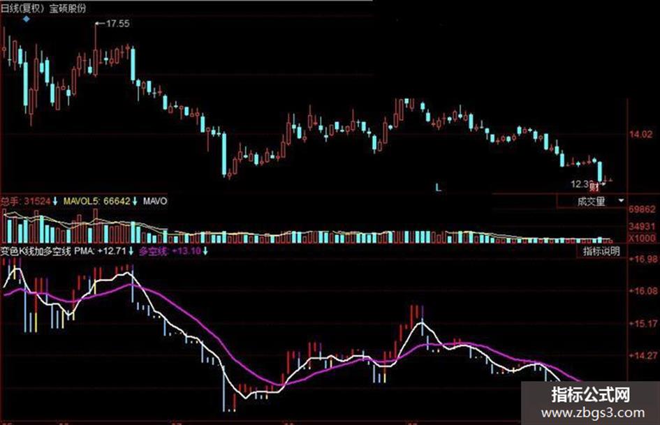 指标用法:当白线穿越多空线且K线颜色变红色时,是买入信号,当K线颜色变蓝色时,是预警信号,可以考虑减仓,当白线下穿多空线时,是卖出信号。