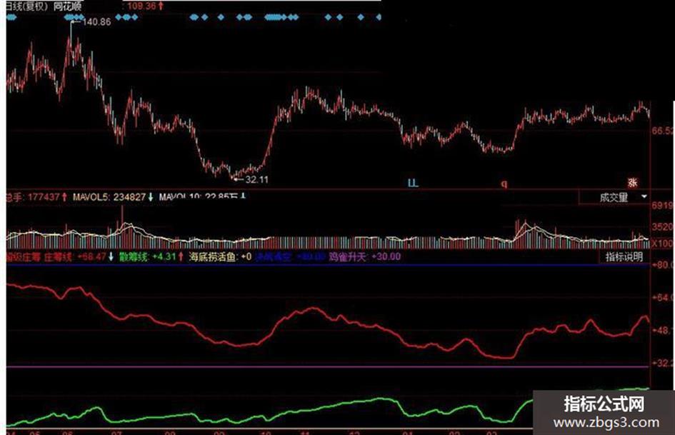 鸡雀升天:IF(CROSS(庄筹线,散筹线) AND CC=1 AND DD>=5 ,10,30),COLORF00FF0;