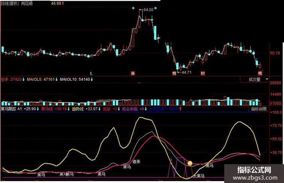 大势已去:IF(CROSS(黑马线,A1)AND 黑马线>70 AND 趋势线>80,90,100),COLORFF0000;