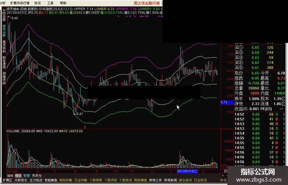 3.当轨道线ENE向上缓慢运行时,如果股价上涨穿越上轨UPWER后,很快掉头向下并跌穿上轨UPWER时可以卖出。