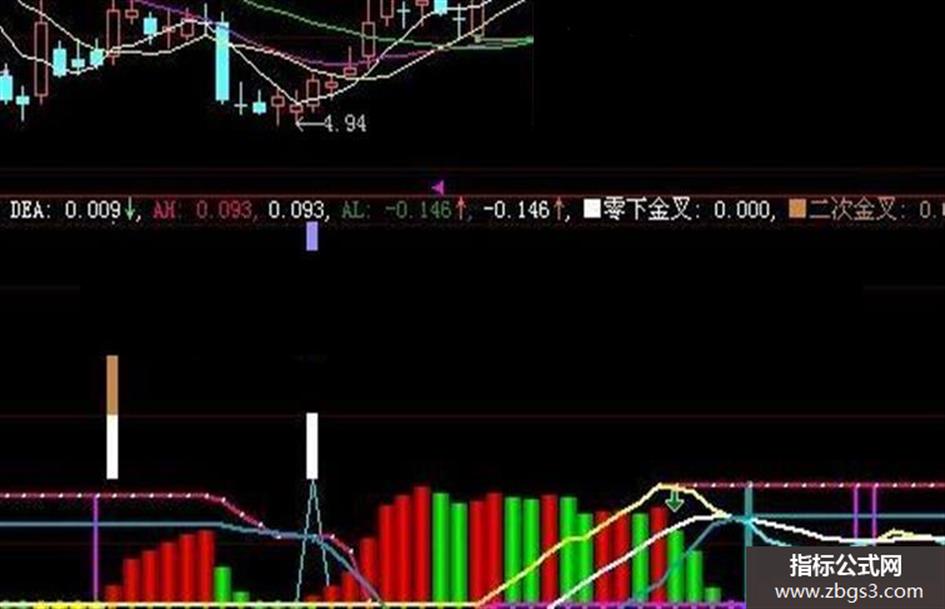 ■零下金叉:IF(CROSS(DIFF,DEA) AND DIFF<-0.001,0.3,0),COLORWHITE,POINTDOT;