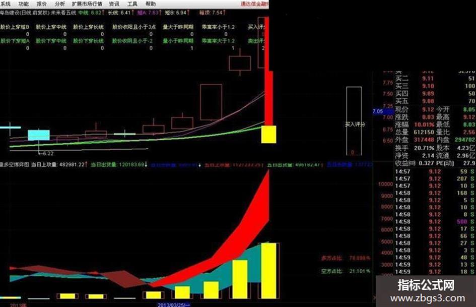 指标名称:《量多空博弈》 运行环境:通达信金融终端v7.02 说明:如要有全部效果的代码将在二楼有偿最低优惠订阅; 股票的涨跌,量是决定性的因素, 本指标是根据统计学原理趋势分析,把一天中三种力量, 即上攻量、出货量、杀跌量分解出来,准确率达95%以上; 当5日上攻量上穿5日出货量和杀跌量时,行情就此启动; 当蓝色状带象乌云一样在红色上空时,最好不要介入。