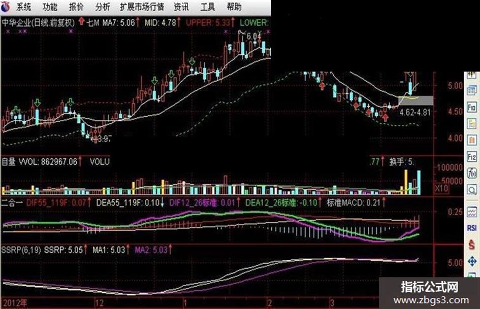 指标不是万能的,到处找指标,不如就用系统自带的指标,稍微组合,就是一个很好的指标.这是一个用 7MA和BOLL组合的主图指标,简明扼要,具有很高的实战价值.大家可以试试.请看 MA7:EMA(CLOSE,7),COLORFFFFFF; MID:MA(CLOSE,20),COLORYELLOW; UPPER:MID+2*STD(CLOSE,20),COLORRED,DOTLINE; LOWER:MID-2*STD(CLOSE,20),COLORGREEN,DOTLINE;