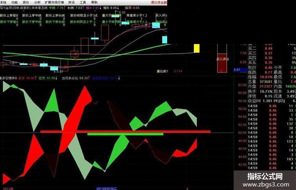 指标名称:《量多空博弈》2013.42版 中间的红绿线表示当天多空的强度