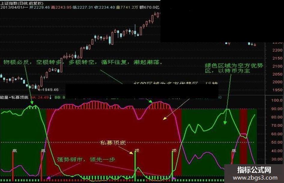 当多方线(洋红色线)突破强势线后需密切关注,在强势线上掉头向下可适当减仓,但在背景红色未变的情况下又掉头向上,可加仓跟进。当空方线(绿线)突破强势线后预示走势接近阶段底部区域,应密切关注进场时机,配合“底”部提示,成功率很高。