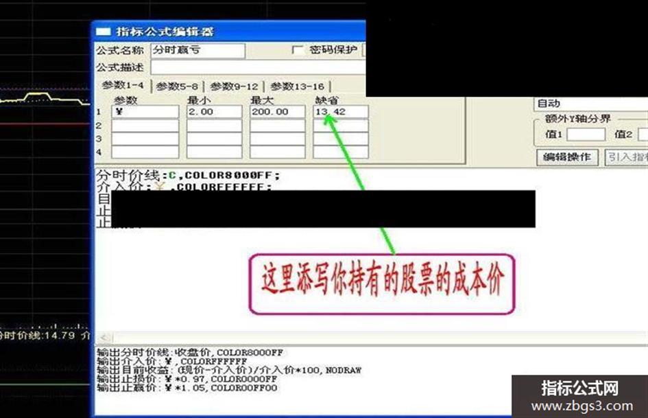 八 分时副图以止赢5%止损3%为依据(点位可自行更改),介入的个股要输入成本价,即可在副图显示三线(成本线,止赢线,止损线),以做盘中参考