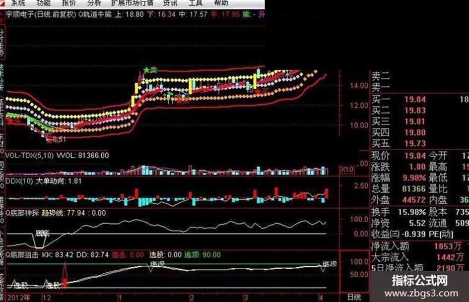 1。轨道线:类似布林通道线,一般股价到达上轨有压力,股价到达下轨有支持;连续涨停个股无效。